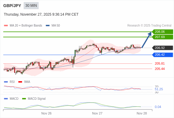 英镑/日元 当日内 : 看涨,当 206.42 为支撑位,目标定在208.06。