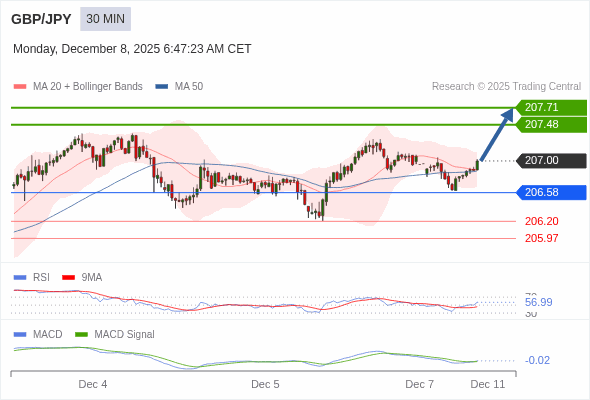 英镑/日元 当日内 : 看涨,当 206.58 未被跌破。