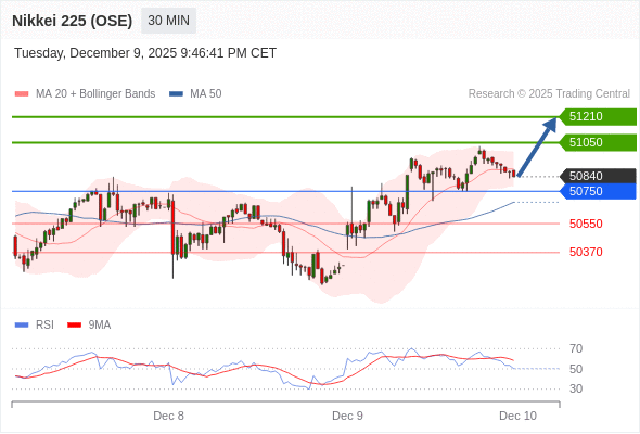 在 50750 之上,看涨,目标价位为 51050 ,然后为 51210 。