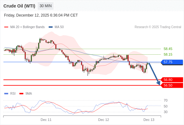 交易策略: 在 57.75 之下,看跌,目标价位为 56.80 ,然后为 56.50 。