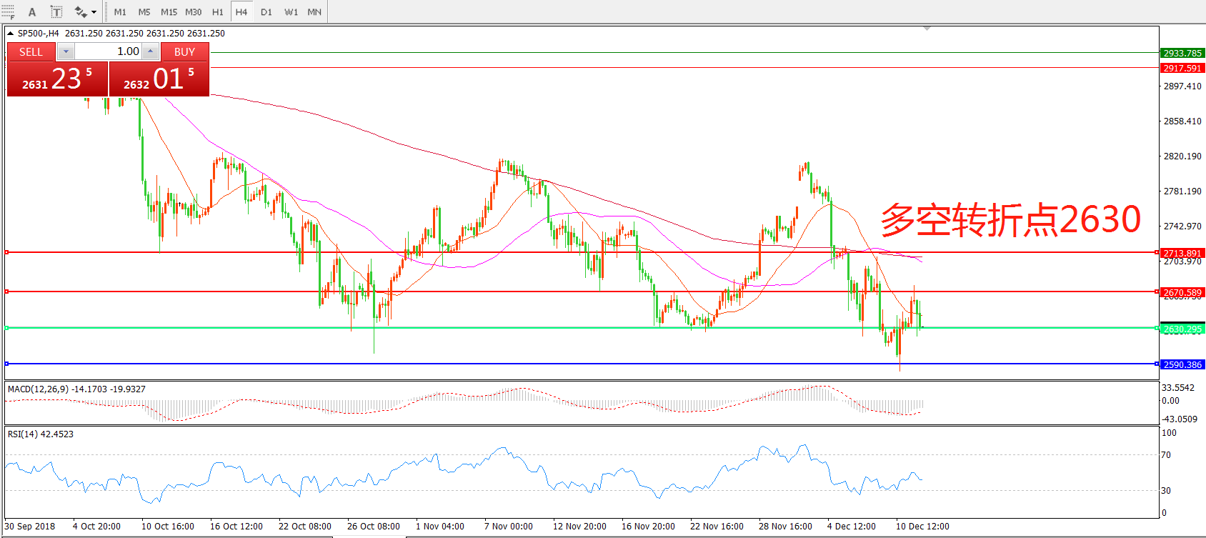 4小时图看,标普500连续下破关键支撑获得反弹,但整体价格直接跌至均线系统之下, MACD绿柱缩短,短期震荡整理的概率较大。