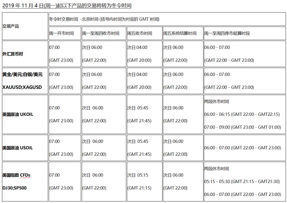 欧洲时区将于2019年10月28日(周一)及北美时区将于2019年11月4日(周一)开始分别转为冬令时交易时间, 各欧美市场产品的交易时间将随调整为冬令时交易时间,敬请留意!